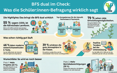 Wie erleben Schüler:innen die BFS dual wirklich – im Alltag, im Unterricht und mit Blick auf ihre berufliche Zukunft? Um das nicht „aus dem Bauch heraus“ zu beantworten, haben die BFS-A-Schüler:innen der BFS dual eine Befragung aller Schüler:innen dieses Bildungsgangs durchgeführt. 67 Lernende haben ihre Chance genutzt und ihre Erfahrungen geteilt – mit vielen positiven Rückmeldungen und konkreten Ideen, wie die Schulform weiterentwickelt werden kann.