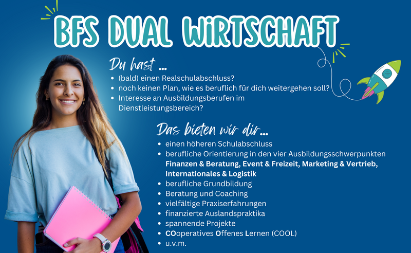 +++ Die Informationen zu dem Bildungsgang BFS dual wurden entsprechend der aktuellen Entscheidung aus dem Kultusministerium (Ministerbrief v. 16.02.2026) und anhand der Durchführungsbestimmungen für das Innovationsvorhaben Berufsfachschule dual im Schuljahr 2026/2027 (Durchführungsbestimmungen 27.02.2026) angepasst. (Stand 04.03.2026) +++