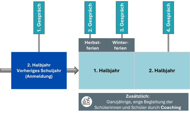 Zusätzlich erfolgt ein begleitendes Schülercoaching von ausgebildeten Coaching-Lehrkräften, die dich mit deinen ganz persönlichen Herausforderungen und Wünschen unterstützen. Damit du eine Vorstellung von einem Coachinggespräch bekommst und selbst erkennst, wie Coaching dich unterstützen kann, ist das erste Coachinggespräch für dich verpflichtend. Danach kannst du aufgrund deiner gesammelten Erfahrungen selbst entscheiden, ob du die Coachinggespräche weiterführen möchtest oder nicht.