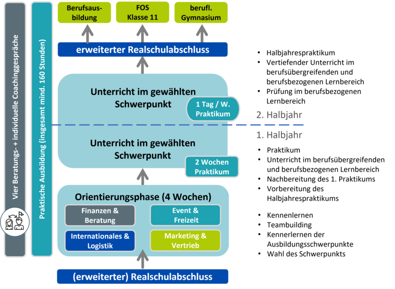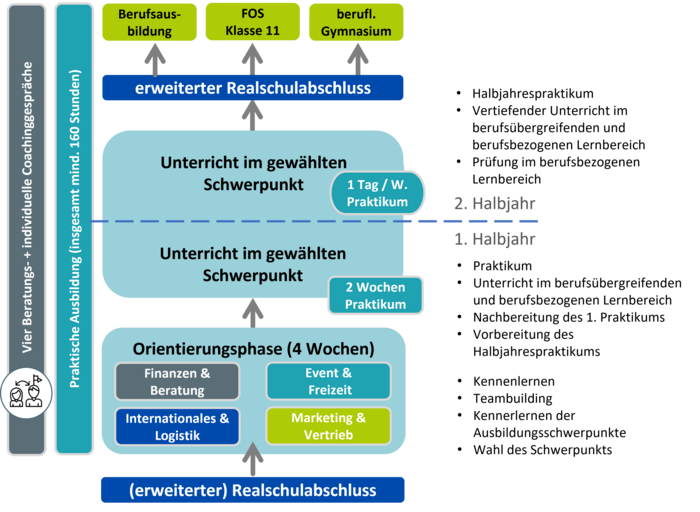Weil du bei uns nicht einfach „ein Jahr Schule“ machst, sondern ein Jahr, das dich spürbar voranbringt. Im Rahmen der vier Ausbildungsschwerpunkte (Finanzen & Beratung, Event & Freizeit, Internationales & Logistik und Marketing & Vertrieb) erhältst du Einblicke in viele verschiedene Ausbildungsberufe mit sehr guten Zukunftsperspektiven.