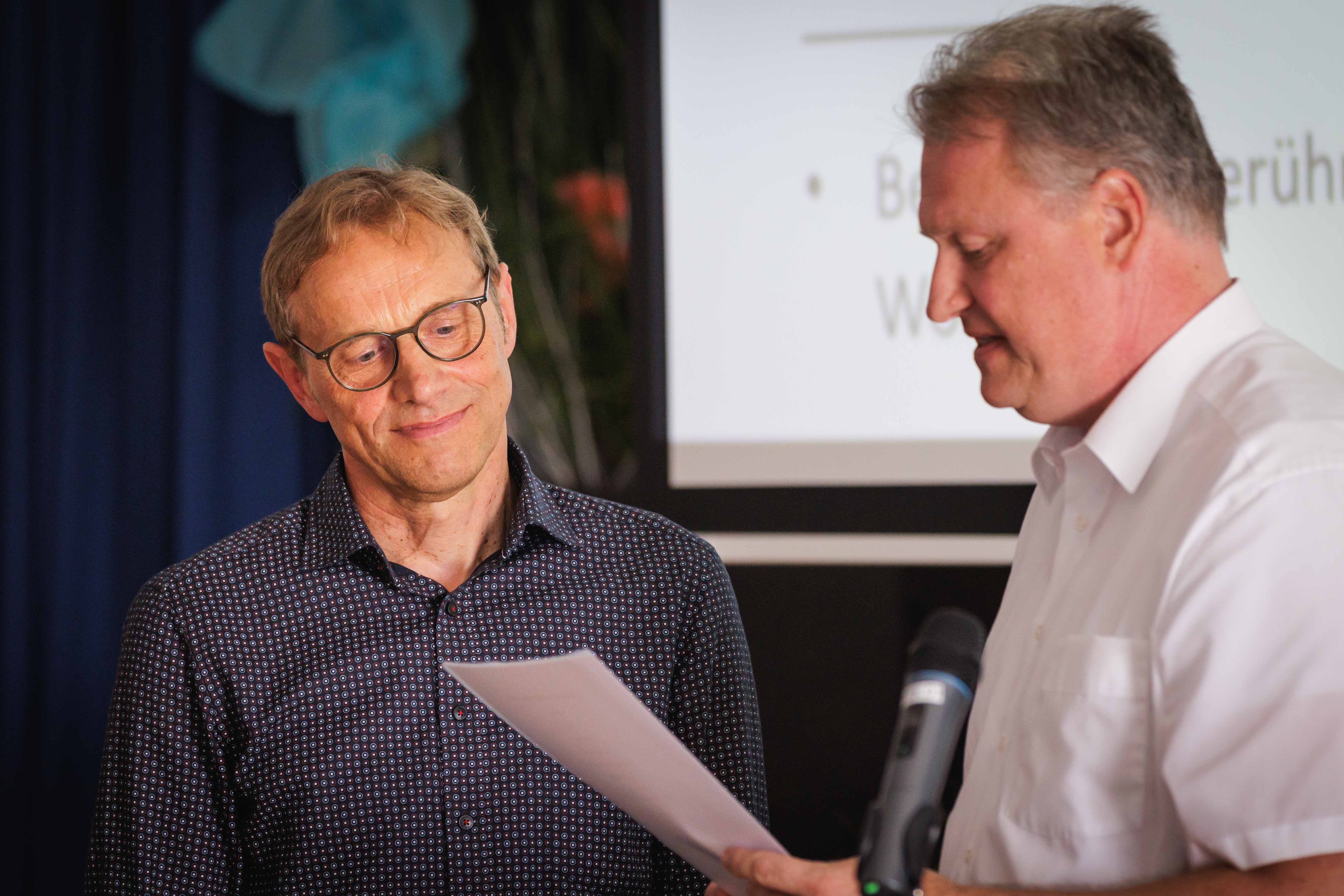 Für Bernhard Landwehr, der seit 2004 Teil des Kollegiums war, wurde es ebenfalls sehr emotional. Die Verabschiedung würdigte vor allem sein Engagement im Groß- und Außenhandel, in der Fachschule Betriebswirtschaft sowie im Bereich Internationales. Als „Gigant der Fachschule“ betitelte ihn André Bloemen, als zuständiger Abteilungsleiter und Weggefährte im Aufbau der Fachschule Betriebswirtschaft. In einer Wortwolke der SchülerInnen aus dem Bildungsgang Groß- und Außenhandel tauchte neben Begriffe wie „humorvoll“, „schlau“ und „ruhig“ auch eine wohl nicht passender zu formulierende Beschreibung auf: Bernhard Landwehr ist „einfach ein geiler Typ“. Eine Fotoshow als Rückblick auf die letzten Jahre, ein Gruß aus Frankreich und warme Worte aus dem Bereich Internationales führten zu einem stillen Moment – Gänsehaut und Tränen in den Augen inklusive. Er selbst bedankte sich für die Freundlichkeit, die ihm immer entgegengebracht wurde und beendete die Verabschiedung mit den Worten „Bleibt beweglich, gesund und munter“.
