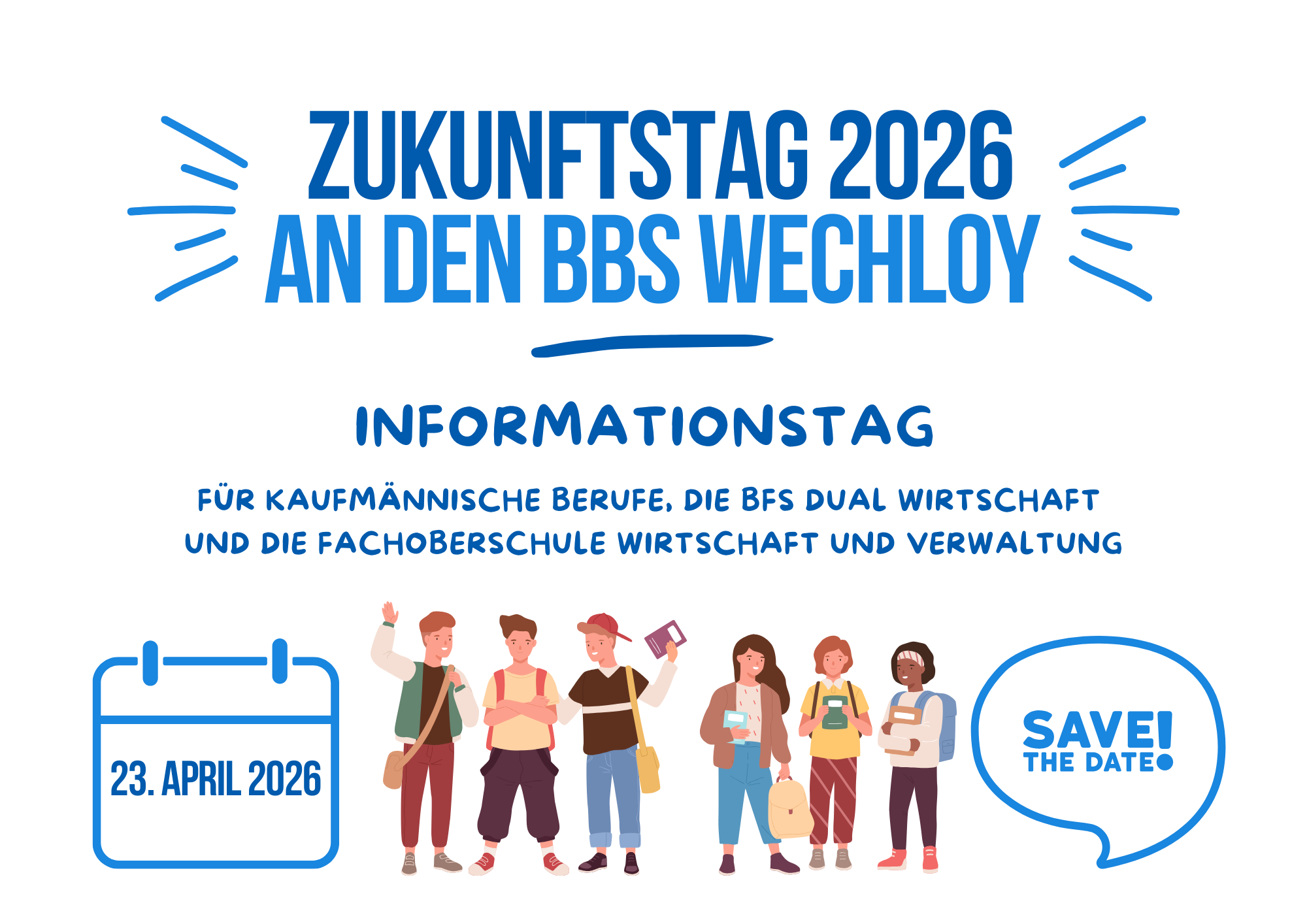 Wir laden alle interessierten Schüler:innen der 8. und 9. Klassen herzlich zu unserem Informationstag für kaufmännische Berufe, die BFS dual Wirtschaft und die Fachoberschule Wirtschaft und Verwaltung ein. Weitere Infos folgen!