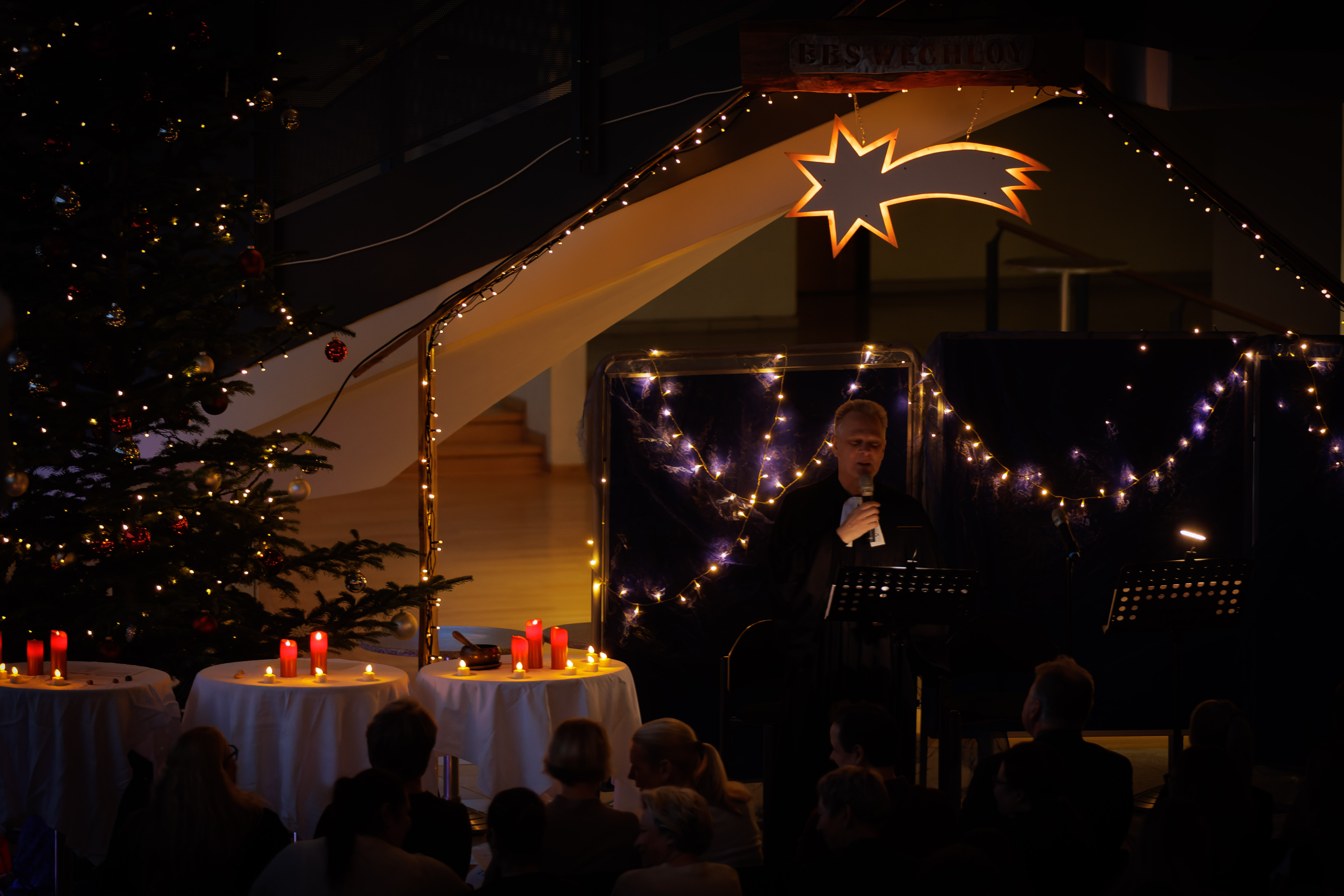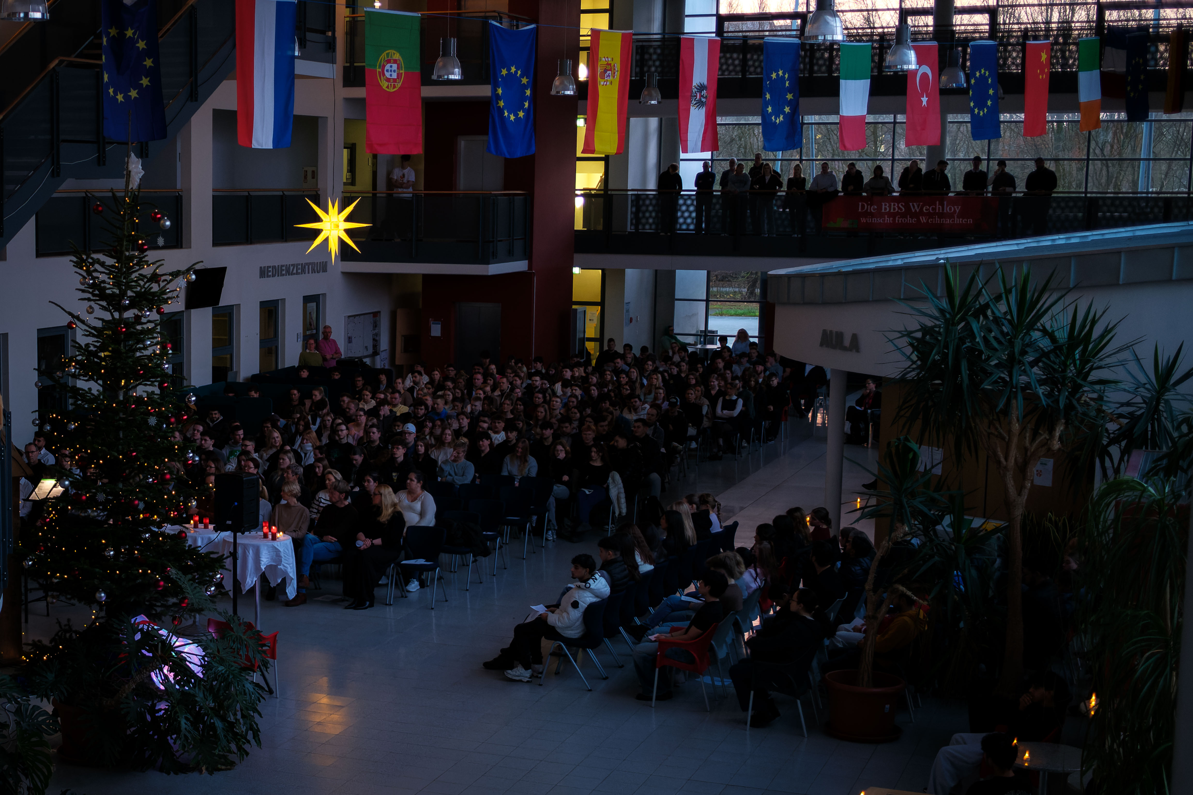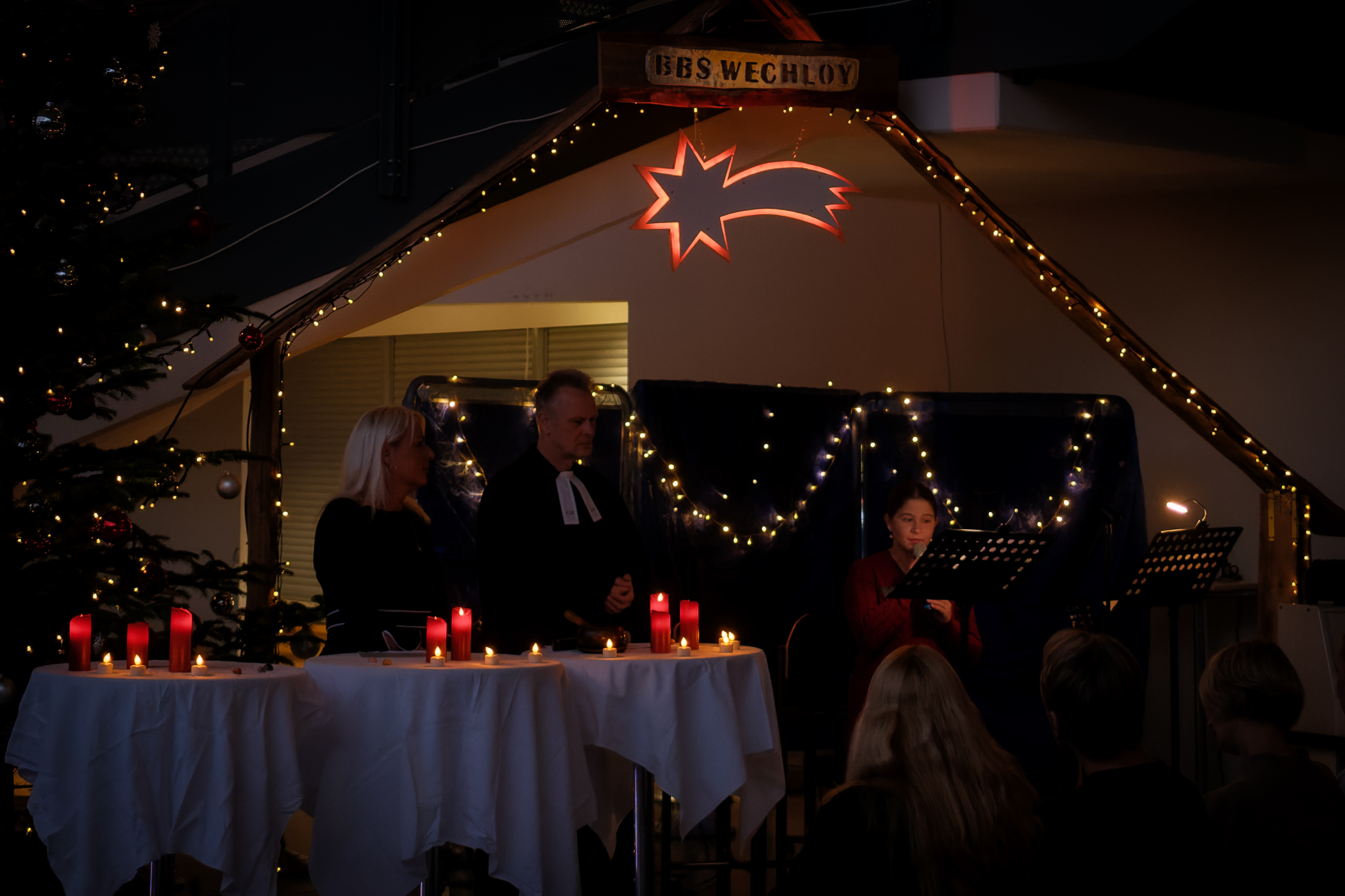 „Unsere Schülerinnen und Schüler erleben jeden Tag, wie unsicher die Welt geworden ist – umso wichtiger ist es, dass Schule ein Ort ist, der zum Verweilen einlädt“, betont Maike Saß als Fachgruppenleitung Religion/Werte und Normen. „Wenn wir einander mit einem Lächeln begegnen, einander zuhören und ernst nehmen, dann wachsen Vertrauen und Mut. Genau das wollten wir mit diesem Adventsgottesdienst spürbar machen.“