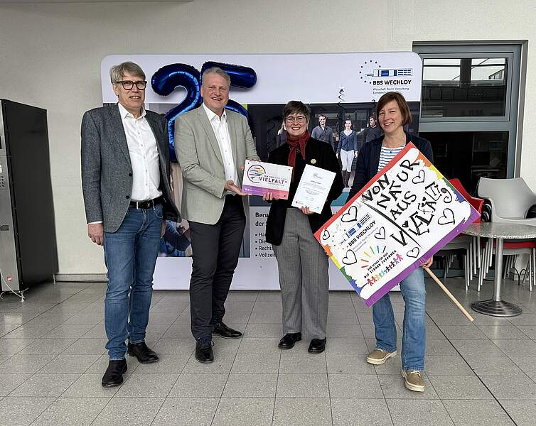 Auf dem Foto von links nach rechts: Matthias Welp, Schulamtsleiter der Stadt Oldenburg, Oliver Pundt, Schulleiter der BBS Wechloy, Franziska Fahl, Regionalkoordination für geschlechtliche und sexuelle Vielfalt vom Regionalen Landesamt für Schule und Bildung (RLSB) Osnabrück und Insa Oetjengerdes als Vertreterin des schulinternen Projektteams der BBS Wechloy.