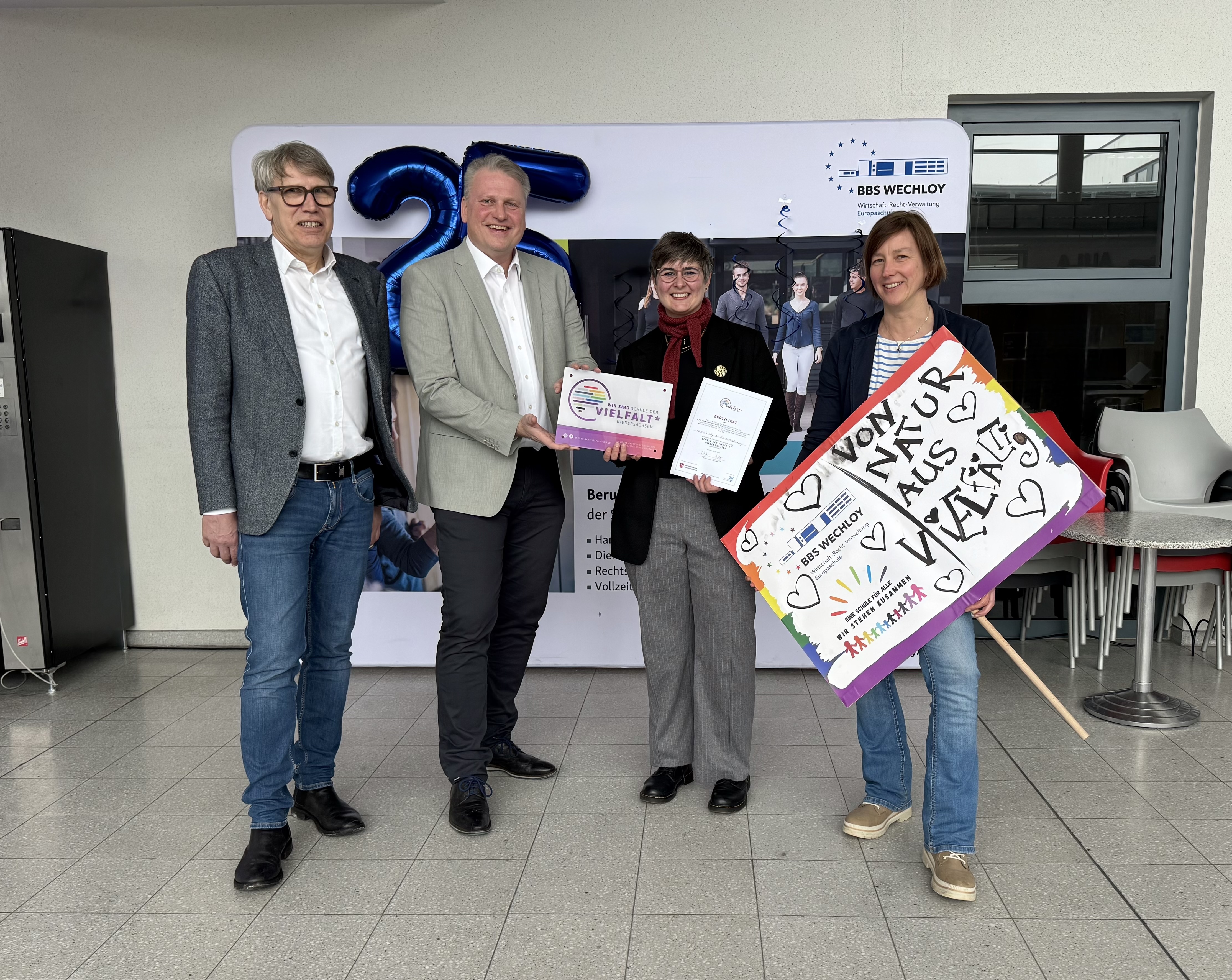 Ursprünglich als größere Feier geplant, musste die Zertifikatsverleihung aufgrund der Wetterlage kurzfristig in einem kleineren Rahmen stattfinden – der Bedeutung des Moments tat dies jedoch keinen Abbruch. Die Verleihung nahm Franziska Fahl vor, Regionalkoordination für geschlechtliche und sexuelle Vielfalt vom Regionalen Landesamt für Schule und Bildung (RLSB) Osnabrück. Ebenfalls anwesend waren Frau Dr. Carmen Wulf, schulpsychologische Dezernentin des RLSB Osnabrück in der Stadt Oldenburg, Matthias Welp, Schulamtsleiter der Stadt Oldenburg, sowie Teile der Schulleitung der BBS Wechloy und Vertreterinnen des schulinternen Projektteams „Schule der Vielfalt“.